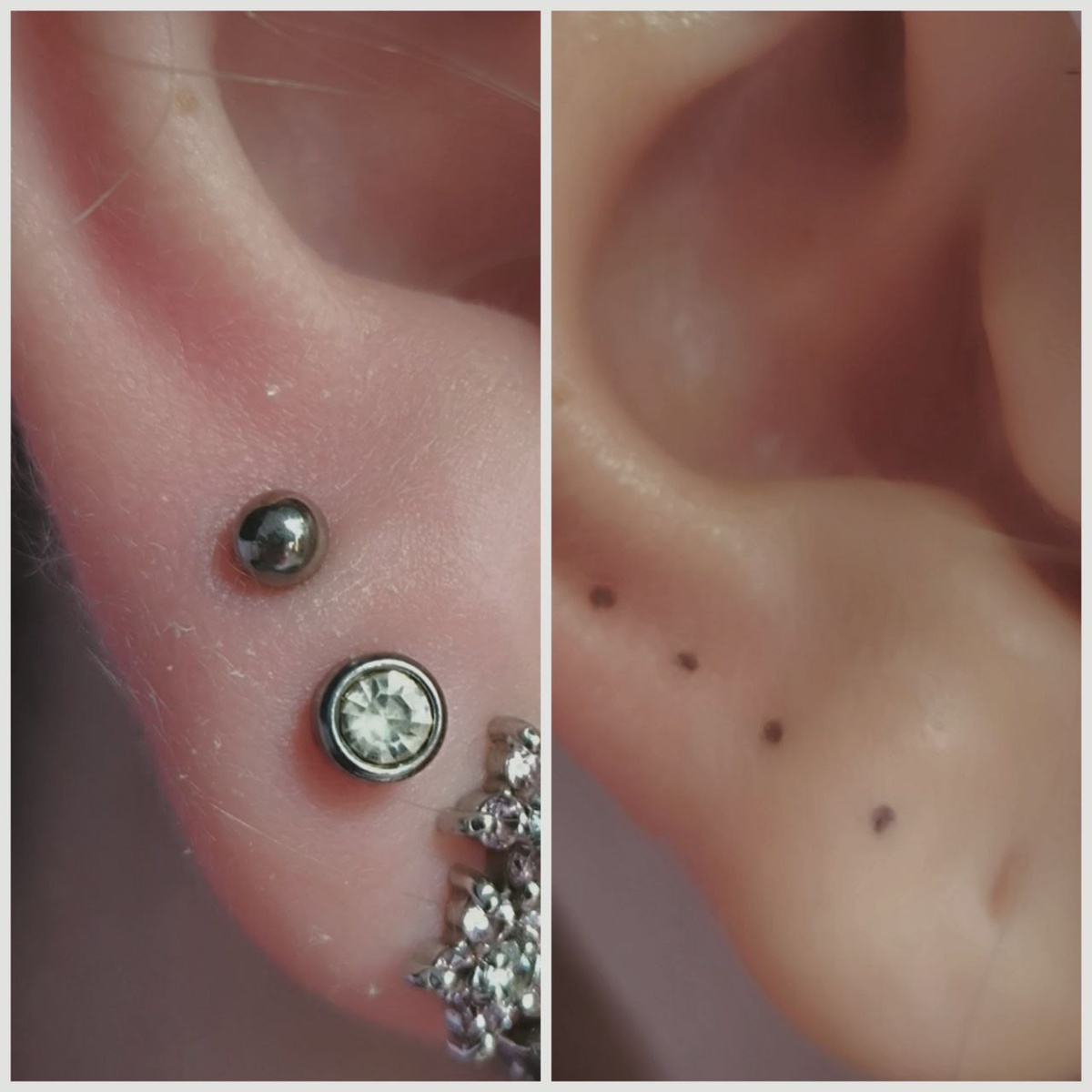 Записались ко мне на вторые дырочки в мочки — ну классика, Lobe #2, дело-то нехитрое! 😌 Но тут я решила немного поумничать и нарисовала точки для "парада планет" из украшений... И ВНЕЗАПНО проколола НЕ ТУ! 🙈 Выше, чем нужно, на целую ступень.