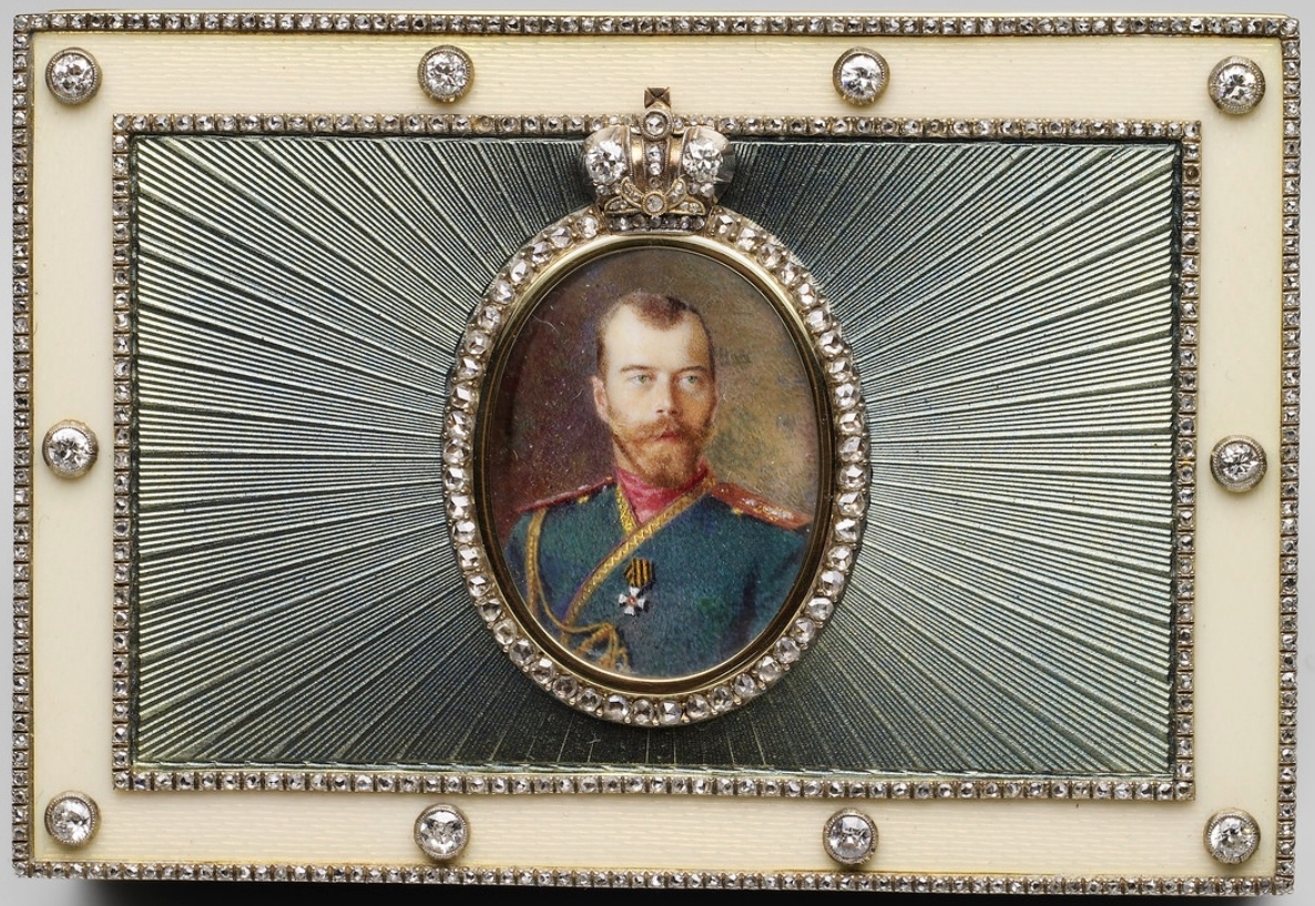 Миниатюра Николая II на шкатулке написана гуашью по слоновой кости — в традиции позднего европейского придворного портрета.