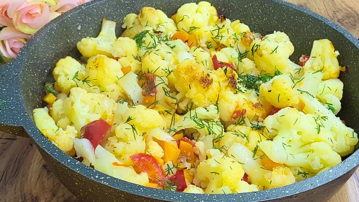 Сегодня я поделюсь с вами рецептом одного из моих любимых блюд из цветной капусты. Для этого рецепта я трачу минимум продуктов, но получаю максимум вкуса! 1. Луковицу и морковь нарезаю мелким кубиком и обжариваю на растительном масле примерно 5-7 минут, чтобы морковь стала мягкой. 2. Добавляю болгарский перец, его тоже нарезаю его кубиками и обжариваю его вместе с другими овощами ещё примерно 3-4 минуты. 3. В последнюю очередь добавляю цветную капусту. Соцветия отделяю от кочерыжки и немного измельчаю их, если они слишком крупные. Сразу накрываю крышкой и ставлю на медленный огонь надо чтобы капуста стала немного мягче, после чего мы всё перемешиваем и таким образом готовим блюдо примерно 25-35 минут, всё будет зависеть от того, насколько мелко у вас нарезана капуста. Периодически помешиваю блюдо, чтоб овощи не пригорали. Также, советую добавить примерно 30-50мл. воды после того, как добавили капусту. Так овощи приготовятся быстрее. В конце посыпаем блюдо зеленью и подаем к столу. Все