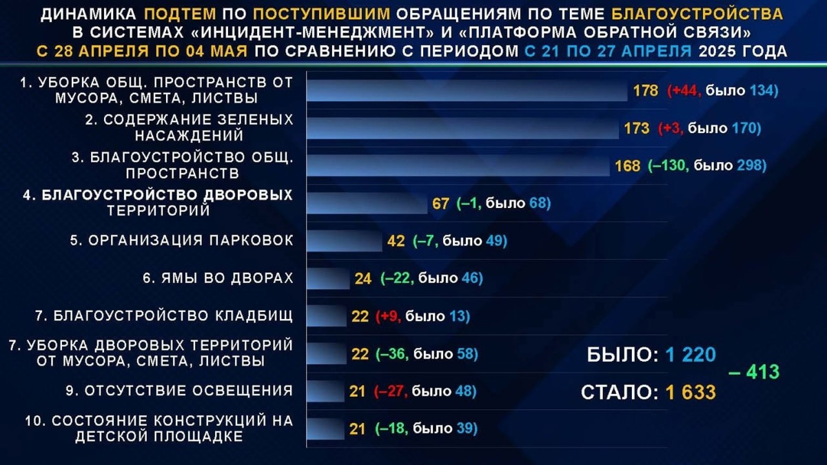 5 895 обращений жителей по разным вопросам с 28 апреля по 4 мая 2025 года зафиксировали информсистемы ЦУР Башкортостана «Инцидент-менеджмент» и Платформа обратной связи. По сравнению с прошлой неделей количество комментариев уменьшилось на 743. Обращений по дорогам – больше всего (1 532). Чаще всего просили заделать ямы и выбоины (441). Также писали по ремонту (421) и строительству дорог (166). 58 комментариев – по обустройству тротуаров, 44 – по ремонту мостов. В целом, по теме дорог наибольшее количество обращений – от жителей Уфы (363), Туймазинского района (203), а также Стерлитамака (71), Салавата (49) и Нефтекамска (48). Тема благоустройства – на второй строчке (1 220). Чаще писали по уборке общественных пространств от мусора (178) и по содержанию зеленых насаждений (173). Благоустроить общественные пространства попросили 168 раз, дворовые территории – 67, по организации парковок оставили 42 комментария. В основном писали жители Уфы, Стерлитамака, Салавата, Нефтекамска и других