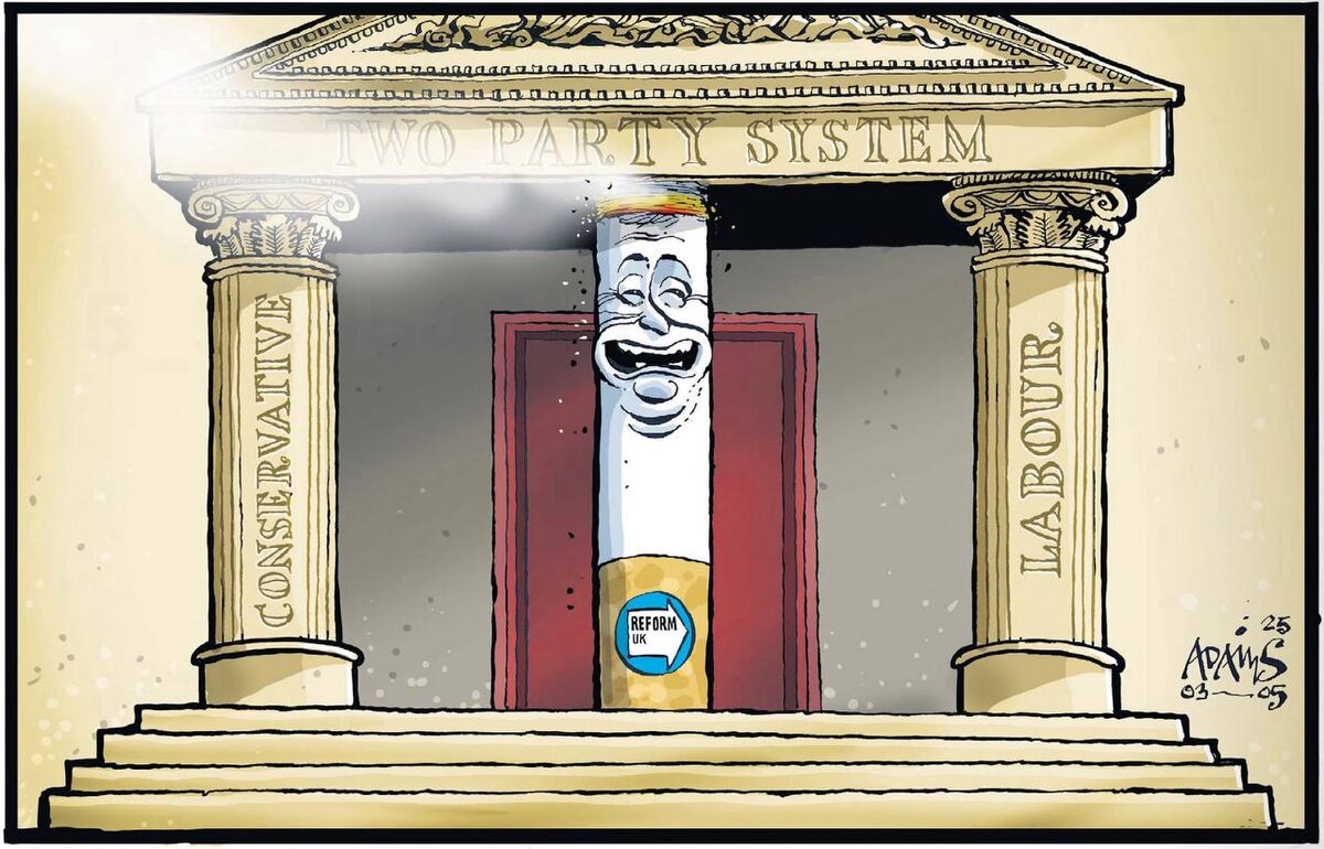 В качестве иллюстрации к статьей выбрал обложку субботней «Daily Telegraph», точнее вряд ли не придумаешь. К двум столпам вековой двухпартийной «демократии» Острова Невезения добавился третий, активно тлеющий. В образе лидера партии «Reform UК» (Реформировать Соединённое Королевство) Найджела Фараджа. Оглушительно победившего на прошедших муниципальных выборах, лидирующего по абсолютно всем социологическим опросам в персональных и партийных рейтингах известных политиков.