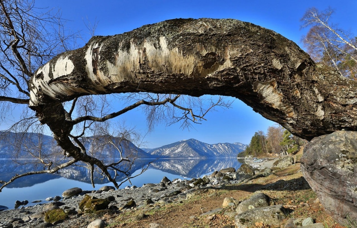 Весенний пейзаж с поклонной березой на берегу Телецкого озера. Фото: Александр Лотов, Алтайский заповедник.