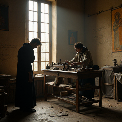 Глава 1: Маленький город и большой ум В небольшом городе, затерянном среди холмов на юге Италии, жил молодой человек по имени Аларик де Виньетто. Его отец был сапожником, а мать — ткачихой, но Аларик не знал ничего о ремеслах. Он любил читать книги, которые приносили купцы из Венеции или Болонии. Следуя за их голосами, он мечтал изменить мир — не через войны и церкви, а через знания. Он был сыном времен, когда Лоренцо ди Виньетто только начал печатать книги, а на улицах Парижа шептали о новом свете: Ренессансе. Но для Аларика это было не просто слово — это была представление о мире без тьмы и одиночества. Он хотел создать машину, которая сможет напечатать книги за минуту, а не год, как делали монахи в монастырях. Он верил: если знания станут доступны всем, то церкви больше не смогут скрывать правду. Глава 2: Печатный пресс Аларик работал ночами, используя кости животных и деревянные листы для создания своих чертежей. Его мечта — механизм из металлических частей, которые будут двигаться