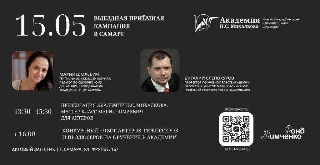 А мы напоминаем, что 15 мая в Самарском государственном институте культуры будет работать выездная приемная комиссия Академии Н.С. Михалкова❗️ Приглашаем начинающих актёров, режиссёров и продюсеров пройти отбор на возможность бесплатного годичного обучения в Академии, а также посетить открытый мастер-класс театрального режиссера Марии Шмаевич. Расписание мероприятий: 📆 15 мая ⏰ 13:30-14:00 – презентация Академии Н.С. Михалкова. ⏰ 14:00-15:30 – мастер-класс театрального режиссера Марии Шмаевич «Принципы театральной биомеханики и пластическая импровизация» для актёров. РЕГИСТРАЦИЯ ⏰ c 16:00 – конкурсный отбор актёров, режиссёров и продюсеров на бесплатное обучение в Академии. ЗАПИСЬ НА ОТБОР 📍СГИК | ул. Фрунзе, 167