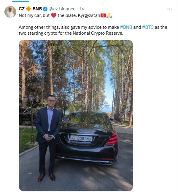 Не моя машина, но номер киргизский. Помимо прочего, я также рекомендовал использовать BNB и BTC в качестве двух стартовых криптовалют для Национального крипторезерва.