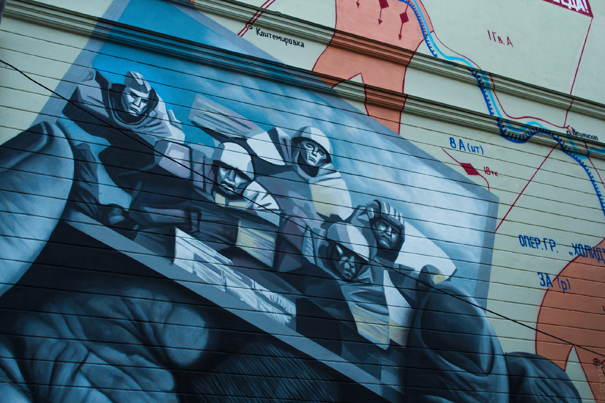 Приветствую всех! Сегодня мы не будем говорить о "белых флагах", повесили – значит повесили. Лично меня это вполне устраивает и не вызывает никаких негативных эмоций. В конечном итоге, пресловутый бренд-бук утверждался на самом высшем уровне и там идею сочли вполне уместной. Все остальное – брюзжание. На улице Кирова (формально дом имеет адрес Площадь Ленина 5) почти закончили расписывать мурал, посвященный наступлению наших войск. И я поехал посмотреть, как делают последние штрихи. Рисунок уже почти готов, осталось дорисовать подпись в левом верхнем углу. Но его исполнитель вместе с оператором подъемника любуются творением из тени. Оказалось, ждут пока стемнеет и привезут проектор, чтобы подсветить эскиз. Ну а пока темнеет, можно было пойти погулять. А спустя полтора часа... Процесс привлекал внимание прохожих еще и тем, что ребята, которые привезли проектор, на месте раздавали бесплатные флажки "9 мая". Многие останавливались и фотографировали. А кто-то пытался делать фотки на хо