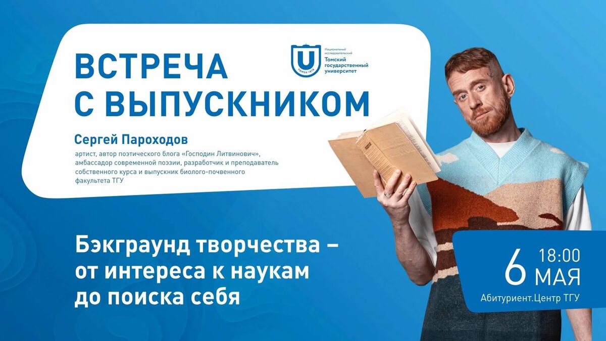 Томск! Открытая встреча с автором поэтического блога «Господин Литвинович», амбассадором современной поэзии, создателем и преподавателем авторского курса, в прошлом — фотографом и телеведущим, а главное с успешным выпускником биолого-почвенного факультета ТГУ. Совместный проект ТГУ и Tomsk.ru «Университет без границ» проводится в формате офлайн-встречи, на которой студенты и гости мероприятия смогут лично пообщаться с выпускниками ТГУ, задать свои вопросы и узнать истории успеха героев проекта. За чашкой кофе Сергей Пароходов расскажет о своем творческом пути: о литературной и сценической деятельности; о фундаментальных знания, элементарной начитанности, насмотренности, колоссальном опыте, который можно получить, постоянно пробуя новое; почему не нужно бояться ошибок даже в конкурентной среде. Приходите! Билет не нужен, нужна регистрация https://tomskru.timepad.ru/event/3347644/