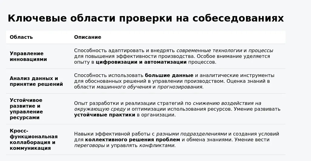 На собеседованиях специалисты уделяют внимание следующим ключевым областям: