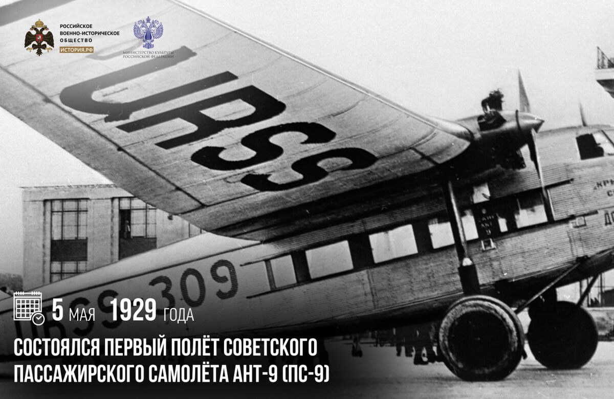 5 мая 1929 года состоялся первый полёт советского пассажирского самолёта АНТ-9 (ПС-9)