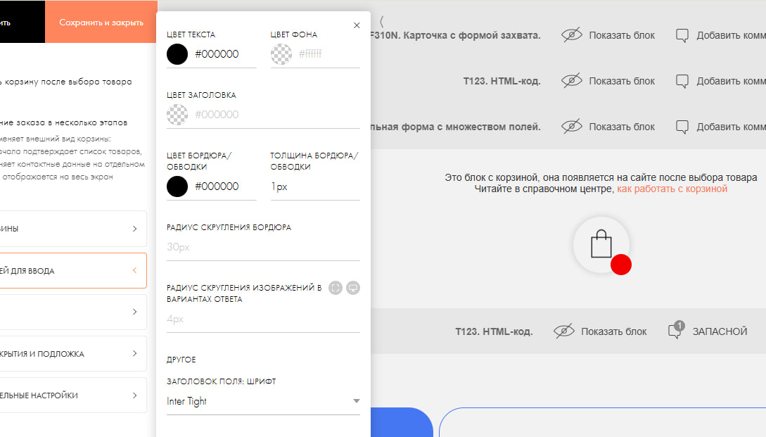 В данном случае мы говорим про блок Тильды SТ100. В настройках блока есть возможность меня шрифты внутри корзины.