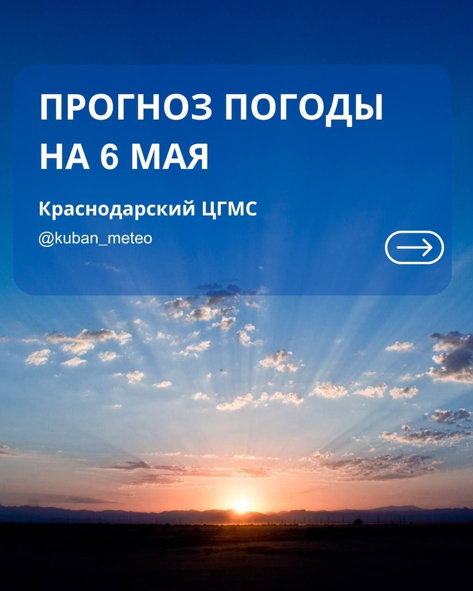 🌤️ Прогноз погоды в Краснодарском крае на 6 мая. Актуальный прогноз с 18:00 5 мая до 18:00 6 мая по всемирному скоординированному времени (UTC). 🌊 На Черноморском побережье: Переменная облачность. Местами кратковременный дождь, гроза. 💨 Ветер южной четверти 6-11 м/с. • Местами порывы до 13 м/с. 🌡️ Температура воздуха: • Ночью: 8…13°. • Днём: 15…20°. Прогноз от @kuban_meteo