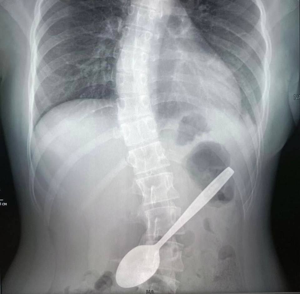 Школьница из Подмосковья случайно проглотила чайную ложку. Девочка проглотила 15-сантиметровую ложку, когда пыталась достать кусок яблока, застрявший у неё в горле. Со столовым прибором в желудке её доставили в хирургическое отделение Центра Рошаля. Врачи сделали рентген и извлекли предмет.