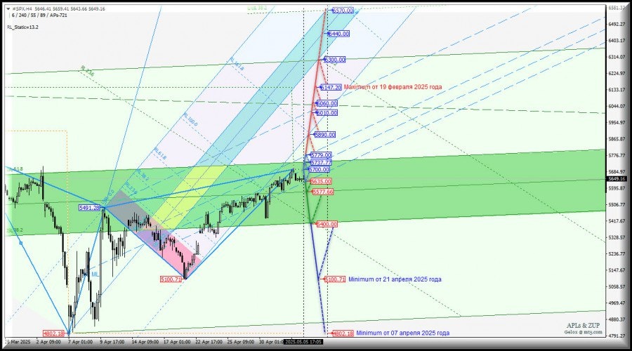 https://basechop.ru/wordpress/?p=41345 Операционный масштаб Minute (таймфрейм h4) Основные технические уровни для торговли #SPX – h4 – обзор вариантов движения c 06 мая 2025 года. Предыдущий обзор #SPX (таймфрейм Daily) от 28.04.2025 г. 18:42 ____________________ #SPX – S&P 500 Index Фондовый индекс, в корзину которого включено 505 акций 500 избранных торгуемых на фондовых биржах США публичных компаний, имеющих наибольшую капитализацию. ____________________ Отработки и направление пробоя границ канала 1/2 Median Line (5635.00 – 5700.00 – 5779.00) вил младшего операционного масштаба Minuette-h1 (c учетом верхней границы ISL61.8 (5737.77) зоны равновесия вил старшего операционного масштаба Minute-h4 ) будет определять развитие движения S&P 500 Index-Daily с 06 мая 2025 года. Восходящее движение: При пробое уровня сопротивления 5779.00 на верхней границе канала 1/2 Median Line Minuette-h1 восходящее движение #SPX может быть продолжено к целям: – начальная линия SSL (5890.00) ви