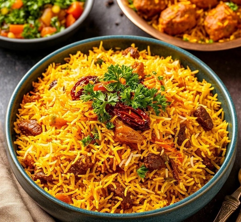 История блюда: от Персии до Южной Азии Бирьяни — это не просто еда, это символ культурного обмена. Его корни уходят в Персию, где слово «beryan» означало метод приготовления мяса перед тем, как соединить его с рисом. В Индию бирьяни принесли иранские торговцы и правители Могольской империи, которые усовершенствовали рецепт, добавив местные специи и техники. Например, бирьяни из Хайдарабада стало легендой благодаря сочетанию маринованного мяса и риса, томлёного в казане. В Пакистане популярность приобрело синдское бирьяни, которое авиакомпании страны включают в меню, чтобы популяризировать национальную кухню. Ингредиенты: симфония вкусов Основу бирьяни составляют: Рис басмати — ароматный, длиннозёрный, который идеально впитывает специи. Мясо или овощи: курица, баранина, креветки, картофель (как в калькуттском бирьяни для экономии). Специи: гвоздика, кардамон, корица, зира, шафран. Часто используют готовые смеси, например, гарам масала или Bombay Biryani Masala. Йогурт и травы — для мари