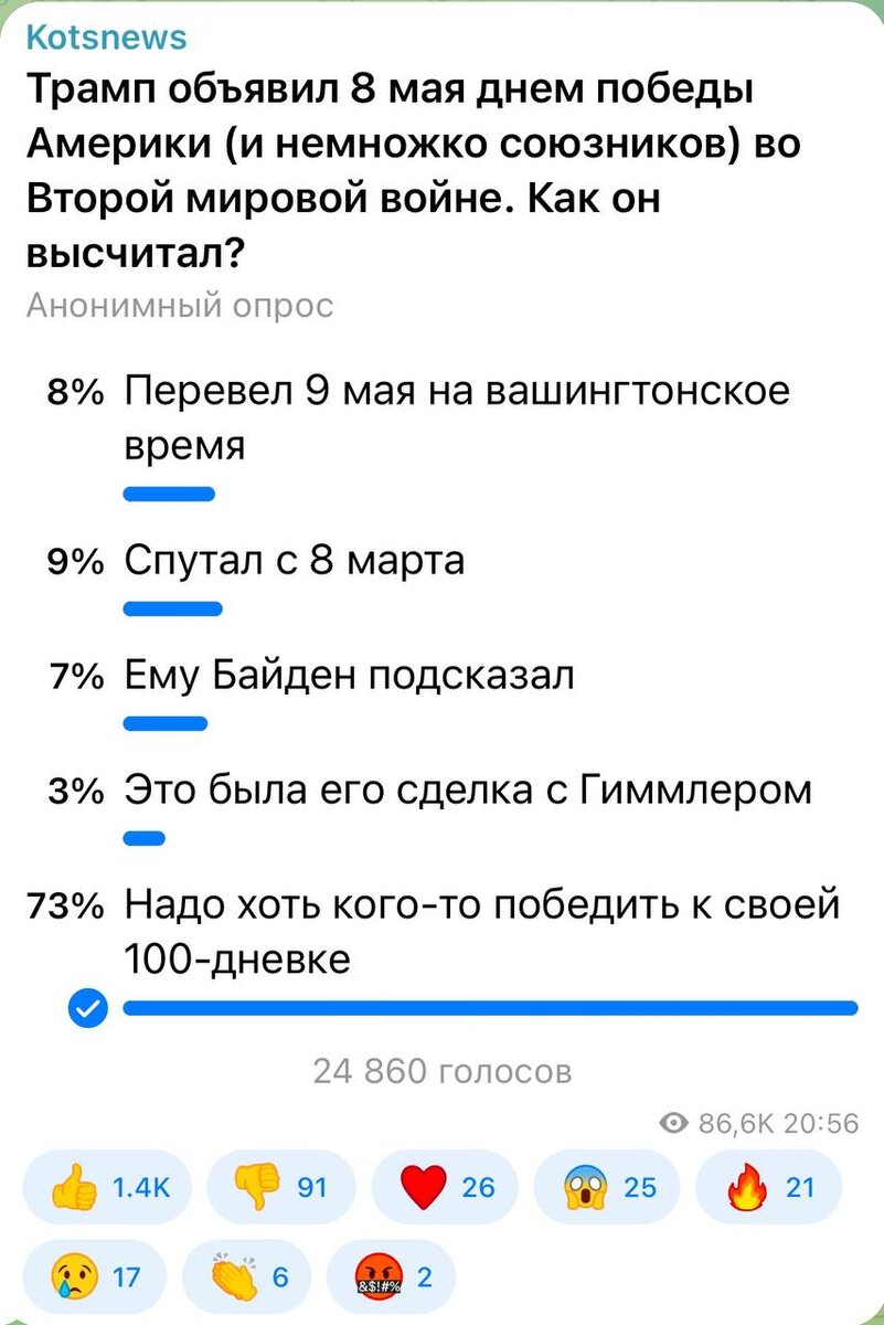 ⚡️⚡️⚡️ 73 процента проголосовавших считают, что Трамп хоть как-то пытается перебить откровенно безрезультативные первые 100 дней своего