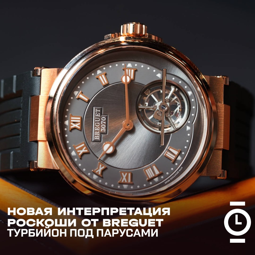 ТУРБИЙОН ПОД ПАРУСАМИ: НОВАЯ ИНТЕРПРЕТАЦИЯ РОСКОШИ ОТ BREGUET #обзор_WD Breguet продолжает развивать коллекцию Marine, представив в 2023 Marine Tourbillon 5577 — спортивные часы с турбийоном, доступные в розовом золоте и платине. Это попытка соединить спортивный характер с высочайшим часовым искусством, и Marine Tourbillon 5577 производит сильное впечатление. Циферблат выполнен в сланцево-сером цвете с чередованием видов отделки: матовое кольцо часов и минут контрастирует с солнечным узором основания. Поле для названия бренда красиво интегрировано в текстуру. Стрелки — фирменные «мариновские»: эффектные разрезанные пополам «яблоки Бреге» с люминофором, контрастным к цвету циферблата. Минималистичный мост турбийона работает на общее впечатление сдержанной элегантности — здесь нет массивной золотой каретки и сложной архитектуры, как в некоторых других моделях Breguet. Однако разметка часов и минут вызывает вопросы: индексные метки и точки с люминесцентным покрытием выглядят менее уто