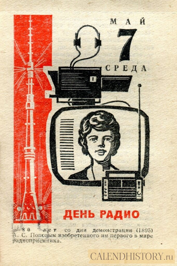 Итак, сегодня 6-го мая и у нас на календаре 1975-й год. Перед нами листок советского календаря для женщин. На календаре у нас среда - 6 мая 1975-го года. ДЕНЬ РАДИО 80 лет со дня демонстрации (1895) А. С. Поповым изобретенного им первого в мире радиоприемника. *** Оборотную сторону листка этого календаря можно посмотреть у нас по ссылке на сайте. Другие листки советских календарей смотрите у нас на сайте - CALENDHISTORY.ru ПОСМОТРИТЕ ЕЩЁ ЛИСТКИ ОТРЫВНЫХ КАЛЕНДАРЕЙ: