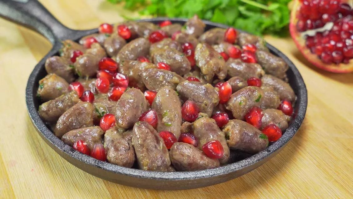 Приготовить куриные сердечки по-грузински очень просто, тем более, что для этого вам понадобится всего 30 минут. К столу подавайте тушеные сердечки со свежими овощами, картофелем, рисом или макаронами. Вкусный обед или ужин гарантирован. Время приготовления: 30 минут Количество порций: 2 Калорийность: 151 kCal 2. Разогреть сковороду с 2 ст.л. растительного масла, положить лук и жарить 2 минуты на среднем огне. 3. Добавить чеснок и жарить еще 1 минуту. 4. Добавить промытые куриные сердечки, соль, перец, кориандр и перемешать. 5. Добавить 100 мл воды и довести до кипения, закрыть крышкой и тушить на слабом огне 20 минут. 6. Добавить сливочное масло, растопить перемешивая и добавить свежую кинзу. Выключить огонь. 7. Выложить куриные сердечки в порционную тарелку и посыпать зернами граната. ___ Если статья понравилась — поставьте лайк 👍
