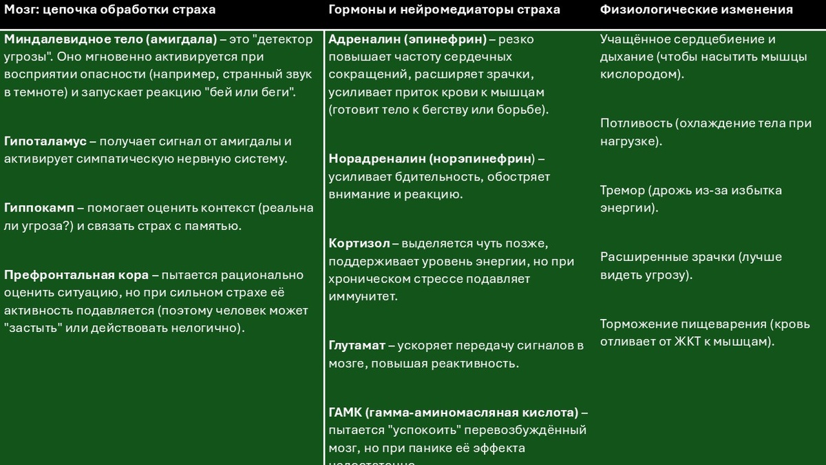Когда человек испытывает страх, в его мозге и теле запускается каскад биохимических и неврологических реакций, направленных на выживание.
