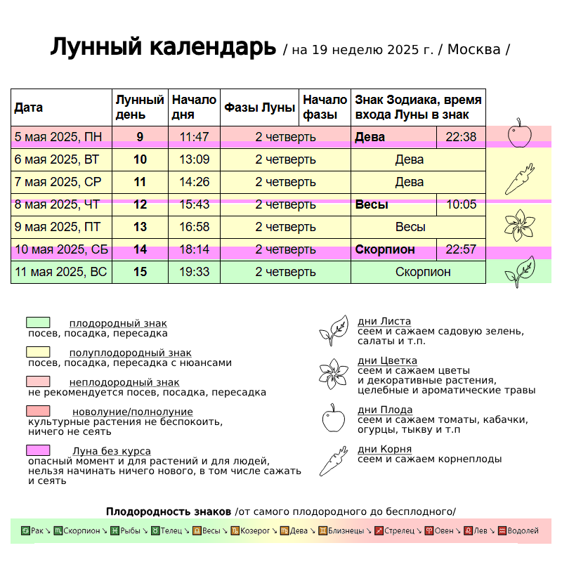 Неделя для садоводства не плохая, единственно много Луны без курса, особенно в субботу, когда традиционно все на фазендах в позе зю. А я не поеду 😁, буду дома утрамбовывать освободившиеся места из под помидорно-перцевой рассады) А так с четверга и до конца недели вполне себе хорошие дни. Весы считаются по плодородности чуть менее плодородным знаком чем Телец, а значит вполне подходят для работ. Прошлую неделю я знатно проленилась, только черенканула свою зелёную розу и всё. На этой неделе постараюсь выполнить план пятилетки)