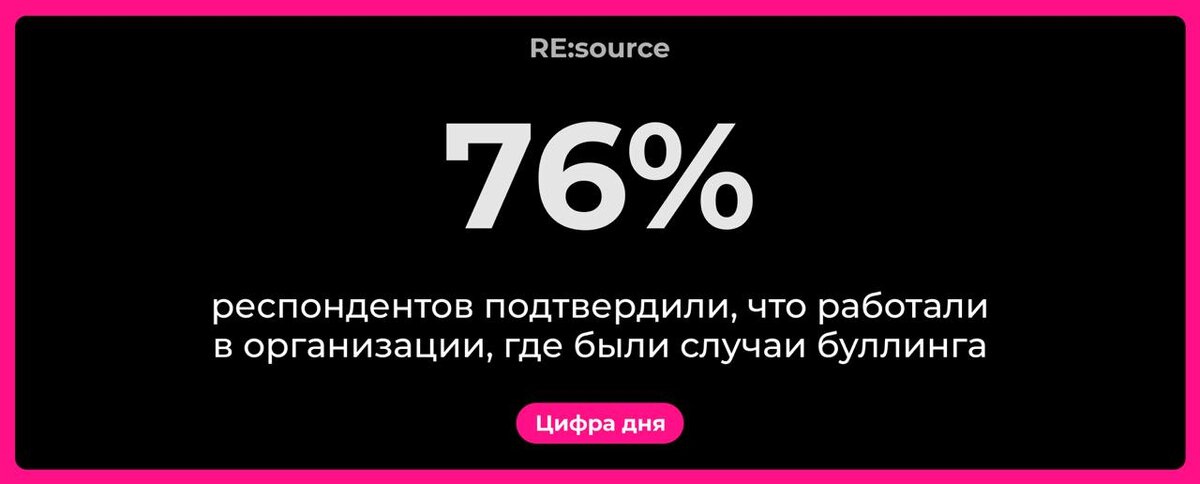 🔹🔹🔹 +13% к частоте упоминаний о буллинге на рабочем месте с 2022 года Буллинг бывает не только в школе, но и на работе. Исследователи сравнили результаты идентичных исследований на эту тему, проводившихся в 2022 и 2025 году. Травлю теперь замечают чаще: либо ее стало больше, либо ее лучше распознают. А вот по существу изменений почти нет: все так же буллинг происходит в виде психологического давления, все так же жертва чаще всего — женщина (69%), новый сотрудник (47%) или специалист высокого уровня (45%). Кстати, на всякий случай: если вас заставляют работать между праздниками — это все-таки не буллинг. Хотя очень похоже. Источник: Академия социальных технологий, Проект «Компании для Всех Возрастов» (рус) #цифрадня Подписаться на RE:source