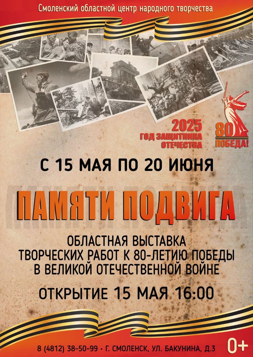 🖼15 мая в 16:00 приглашаем на открытие выставки творческих работ участников регионального конкурса «Памяти подвига», посвященного 80-летию Великой Победы. 🔸️В конкурсе приняли участие педагоги дополнительного образования, учащиеся художественных школ, художники-любители, мастера декоративно-прикладного искусства, а также студенты творческих объединений Смоленска и области. 🔸️В экспозиции будут представлены работы от классической живописи до современных арт-объектов, посвященных великому подвигу советского народа. 🖼Не упустите возможность первыми узнать имена победителей конкурса и окунуться в мир творчества, вдохновленного великой историей нашей страны. Вход свободный. 📍Адрес: ул. Бакунина, 3 ☎️Телефон: 38-50-99 #СмоленскийЦентрНародногоТворчества