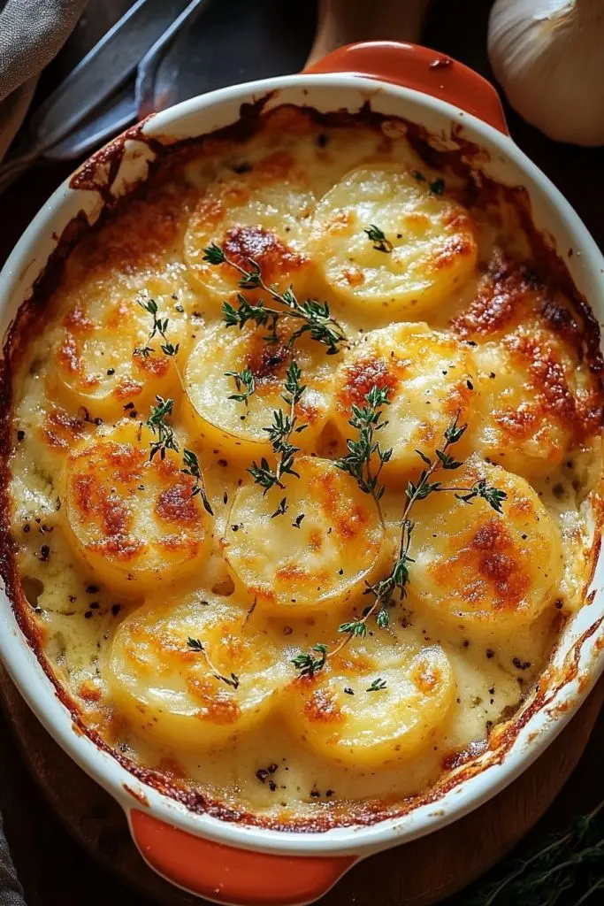 Приготовьте обязательно. Очень вкусная картошка! Хороша и как шикарный праздничный гарнир, и как самостоятельное блюдо. 1 кг картофеля 400 мл сливок 1 шт. репчатого лука 5 зубчиков чеснока 30 гр. сливочного масла 0,5 ч. л. соли 0,5 ч. л. молотого черного перца молотый мускатный орех на кончике ножа тимьян или другие пряности по желанию 100 гр. тертого сыра кипяток Картофель почистить и нарезать кружочками. Залить кипятком. Оставить на 15 минут. Растопить сливочное масло и обжарить в нем репчатый лук кубиками. Добавить измельченный чеснок. Подержать на огне 2 минуты. Влить сливки, дать им закипеть. Переложить картофель из кипятка в кипящие сливки. Добавить 0,5 стакана кипятка. Уменьшить огонь до среднего-слабого, накрыть посуду крышкой и готовить, пока картофель не станет мягким, около 15-20 минут. Добавьте приправы по вкусу. Выложить сливочно-картофельную смесь в подготовленную форму для запекания. Равномерно посыпать тертым сыром. Запекать гратен в предварительно разогретой духовке,