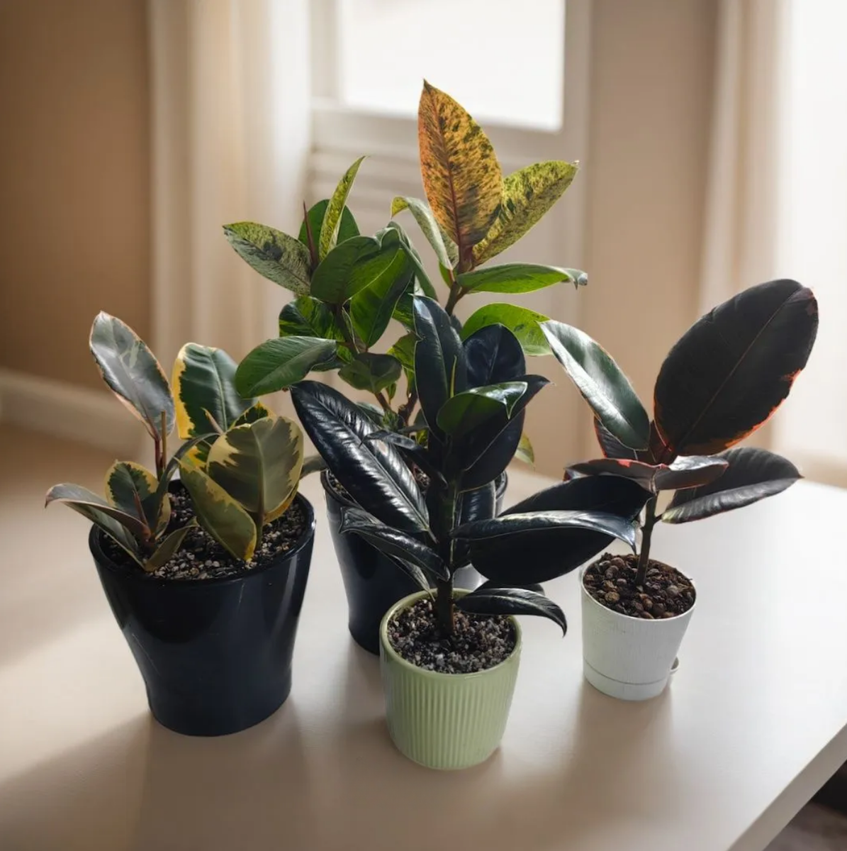 Друзья, устроила я сегодня смотр своим фикусам эластика. Других у меня нет, пока что я фанат и поклонник только эластики))) Совсем не мое это фикусы Бенджамина. А из тех что рассматриваю к покупке это Альбомаргината и Триангулярис вариегатный. А пока что у меня вот такой набор имеется: Самым первым ко мне приехал благодаря Авито фикус Шривериана. Вообще он показался мне таким невероятно красивым, что вот вообще никаких больше можно фикусов не иметь, а его так обязательно! Я долго искала свой вариант Шривериана, пока не нашла растение с отрезанной головой и двумя уверенными точками роста. А я, как раз, хочу чтобы все мои фикусы превращались в кусты и деревья ветвистые. Я решила, что мне крайне повезло с такой шикарной заготовкой и немедленно договорилась о покупке. Про его странствия была отдельная статья на канале))) Вот таким он был сразу после пересадки 30 марта И так он выглядит сегодня 5 мая. Немножко подрос, мне кажется. Мне особенно повезло с тем, что у него несколько точек роста
