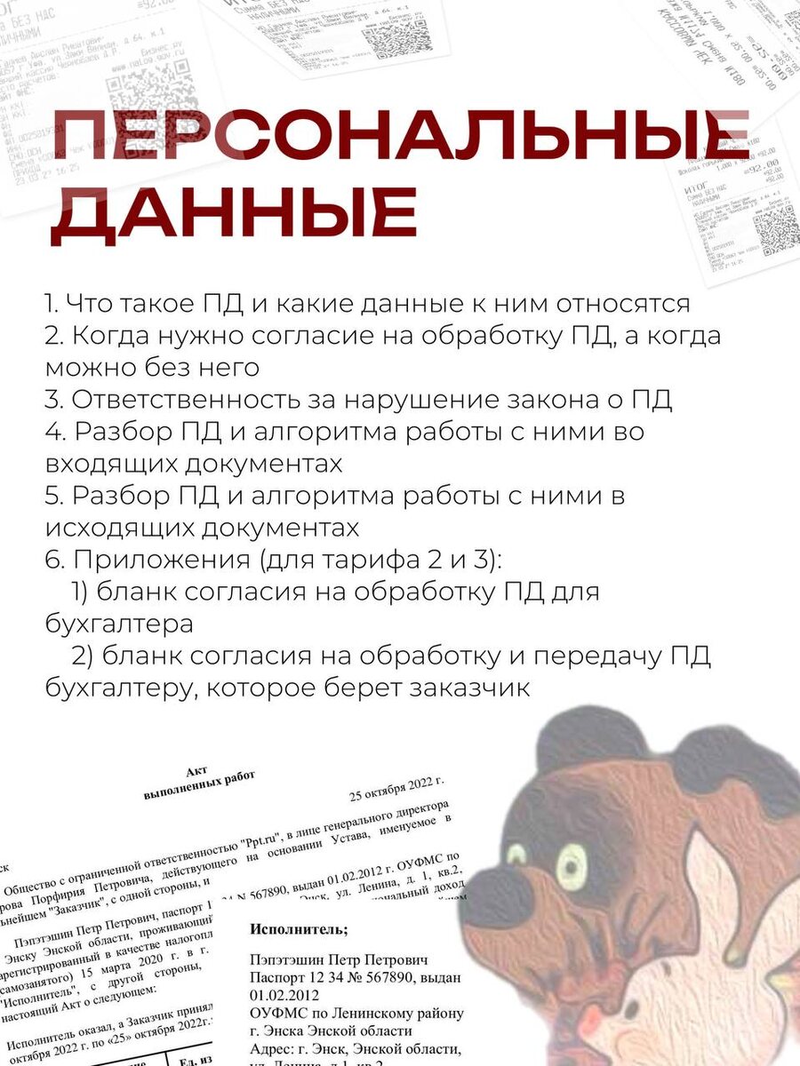 Персональные данные — странный предмет. Договор передал — и штрафы, привет. Когда мы записывали первый модуль курса «Стандарты бухгалтера частной практики», стало очевидно: надо срочно разобраться, где заканчиваются просто «данные», и начинаются персональные — особенно когда речь идет о работниках клиентов и клиентах клиентов. Парадокс: ✏️документы вы не создавали, ✏️в штате не числитесь, ✏️а ответственность — ваша. Поэтому мы записали отдельный урок с юристом Антониной Жулите, где она разобрала: ➡️какие данные требуют согласия, ➡️какие — нет, ➡️как правильно прописать это в договоре, ➡️и влияет ли то, что вы бухгалтер частной практики, а не штатный сотрудник. 12 мая этот урок увидят участники курса «Стандарты БЧП». Так что если вы не с нами — пора. Потому что проверка не смотрит, кто как «договорился». Она смотрит, кто не предусмотрел. Давайте обсудим, если клиент передает нам акт, например, с самозанятым, мы должны брать согласие или нет? Мы уже спросили у юриста, она расска