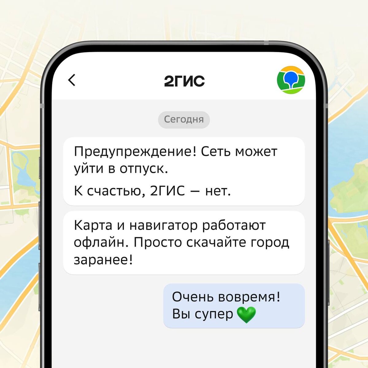 Как же хорошо, что мы работаем офлайн Карта, навигатор — всё под рукой, даже если интернет решит исчезнуть в самый неподходящий момент. 🟢 Скачайте карту заранее — и спокойно пользуйтесь навигацией без подключения к сети. 🚗 Постройте маршрут за город в офлайн-режиме. А пока интернет есть — выберите отель на Отелло. Оставайтесь на связи с городом с 2ГИС 💚