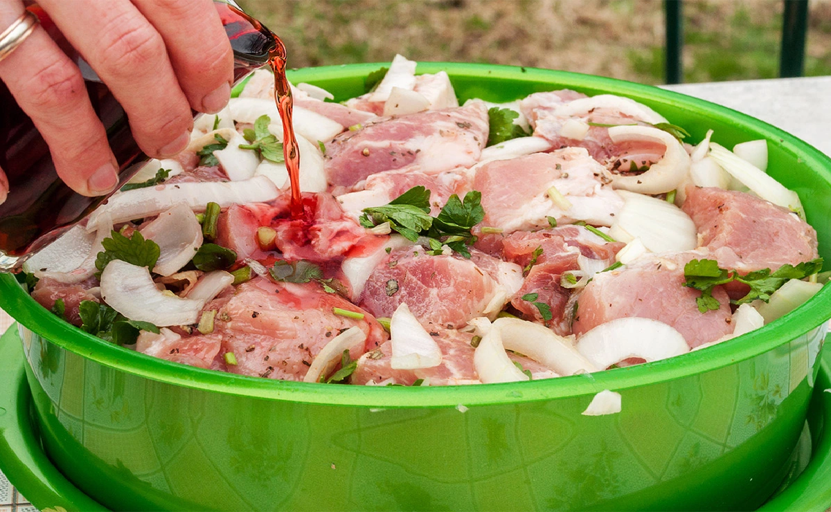 Плюсы: Лук размягчает мясо, уксус добавляет лёгкую кислинку.