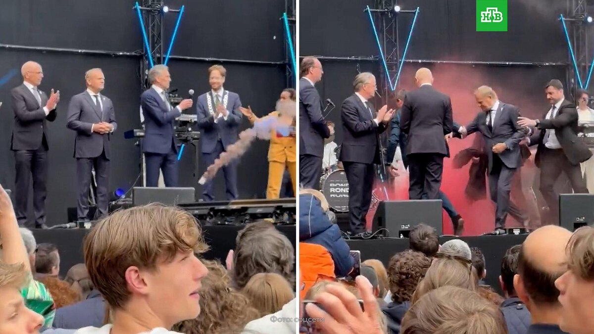 [ Смотреть видео на сайте НТВ ] Пропалестинские активисты сорвали выступление Дика Схофа и Дональда Туска на мероприятии в честь 80-летия освобождения Нидерландов от нацистской оккупации. Дымовая шашка прилетела на сцену в голландском Вагенингене, где в тот момент находились премьер-министр Нидерландов Дик Схоф и его польский коллега Дональд Туск. Сцену быстро заволокло густым красным дымом, а охрана сразу же увела политиков. После того как дым развеялся, Схоф и Туск вернулись на сцену и завершили памятную церемонию торжественным зажжением Огня освобождения. После польский премьер отметил, что «ничего плохого не случилось», и предположил, что шашки бросили те, «кто протестует по вопросу Газы и Палестины», назвав такое поведение неподобающим. При этом Туск добавил, что это «элемент политической жизни» и «не из чего делать проблему», так как никто не пострадал. [ Смотреть видео на сайте НТВ ]
