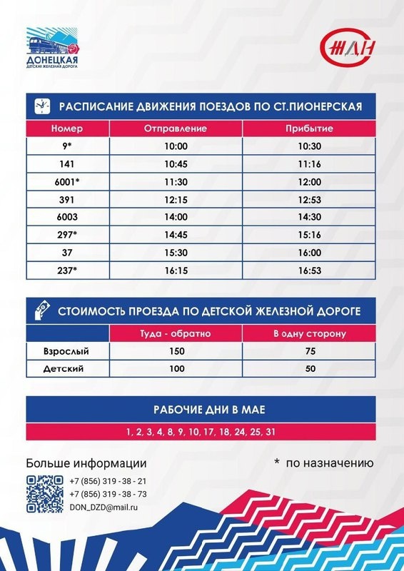 С 1 мая 2025 года Донецкая детская железная дорога открыла новый 53-й сезон работы. Теперь взрослые и дети могут снова посетить любимый аттракцион, прокатиться на фирменном поезде по маршруту от станции «Пионерская» до станции «Шахтёрская». Протяженность маршрута движения поезда составляет 2,1 км,т время в пути в оба конца - 25 минут.