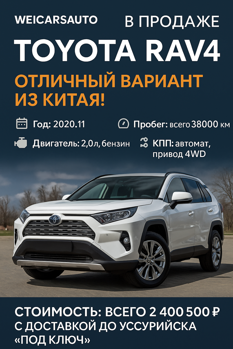 Если вы ищете надёжный, комфортный и универсальный автомобиль для города и путешествий — Toyota RAV4 2020 года станет отличным выбором. Этот легендарный кроссовер отличается высоким качеством сборки, отличной проходимостью и комфортом, который оценят как водители, так и пассажиры. Компания WEICARSAUTO предлагает к продаже проверенный полноприводный Toyota RAV4 из Китая с небольшим пробегом и доставкой «под ключ» до Уссурийска, а также возможностью отправки автомобиля в любой регион России. 📅 Год выпуска: ноябрь 2020