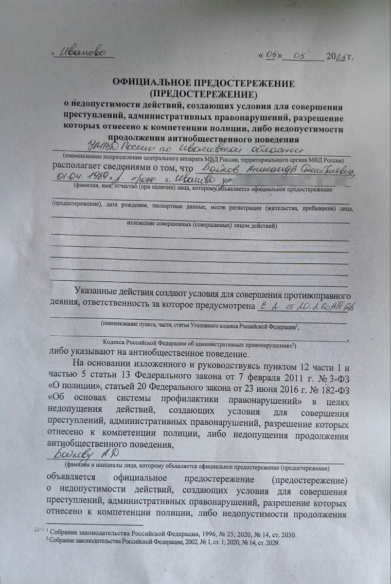 ⚡️Лидеру ивановских коммунистов вручили предостережение за намерение отметить 80-летие Победы! ‼️Сегодня Первый секретарь Ивановского обкома КПРФ Александр Бойков получил официальное предостережение от правоохранительных органов о «недопустимости действий, создающих условия для совершения преступлений». 🔘Поводом для этого странного документа видимо стал отказ властей согласовать традиционную памятную акцию, которую коммунисты ежегодно проводят в преддверии 9 Мая – «Колонну памяти» и автопробег в рамках Всероссийской акции «Знамя нашей Победы». «Власти, как обычно, отмалчиваются, прячутся за формальные отговорки, – заявил лидер ивановских коммунистов Александр Бойков. – Но мы-то понимаем: им не нужна правда о войне, не нужна память о подвиге народа. Им главное – запретить, запугать, заткнуть рот». 🔴Особое возмущение вызывает юридическая несостоятельность врученного предостережения. В документе, нарушающем требования Приказа МВД №119 от 4 марта 2020 года, даже не указано, какие име