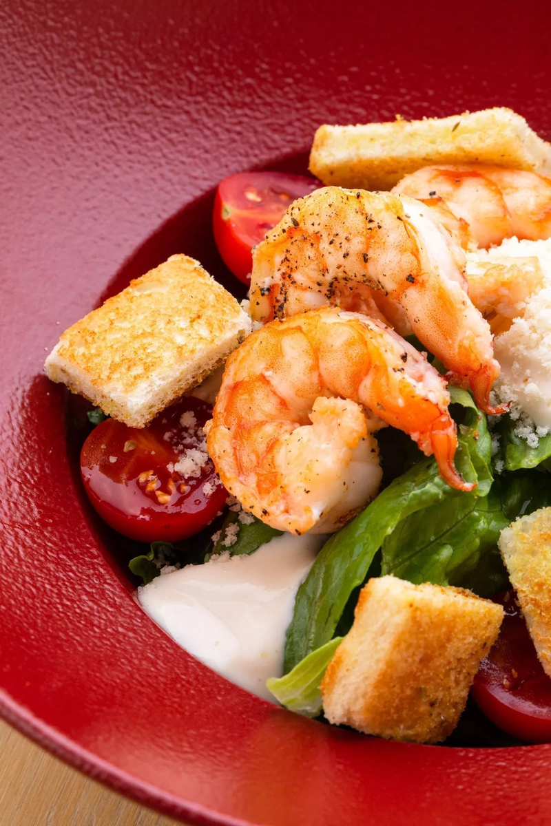 Салат Цезарь с креветками — это настоящая находка для любителей морепродуктов. Он включает в себя свежий ромейн, обжаренные на гриле креветки, томаты черри и хрустящие гренки из белого хлеба, щедро политые соусом Цезарь. Подается этот салат с тертым пармезаном, который добавляет ему особую нотку нежности и пикантности.