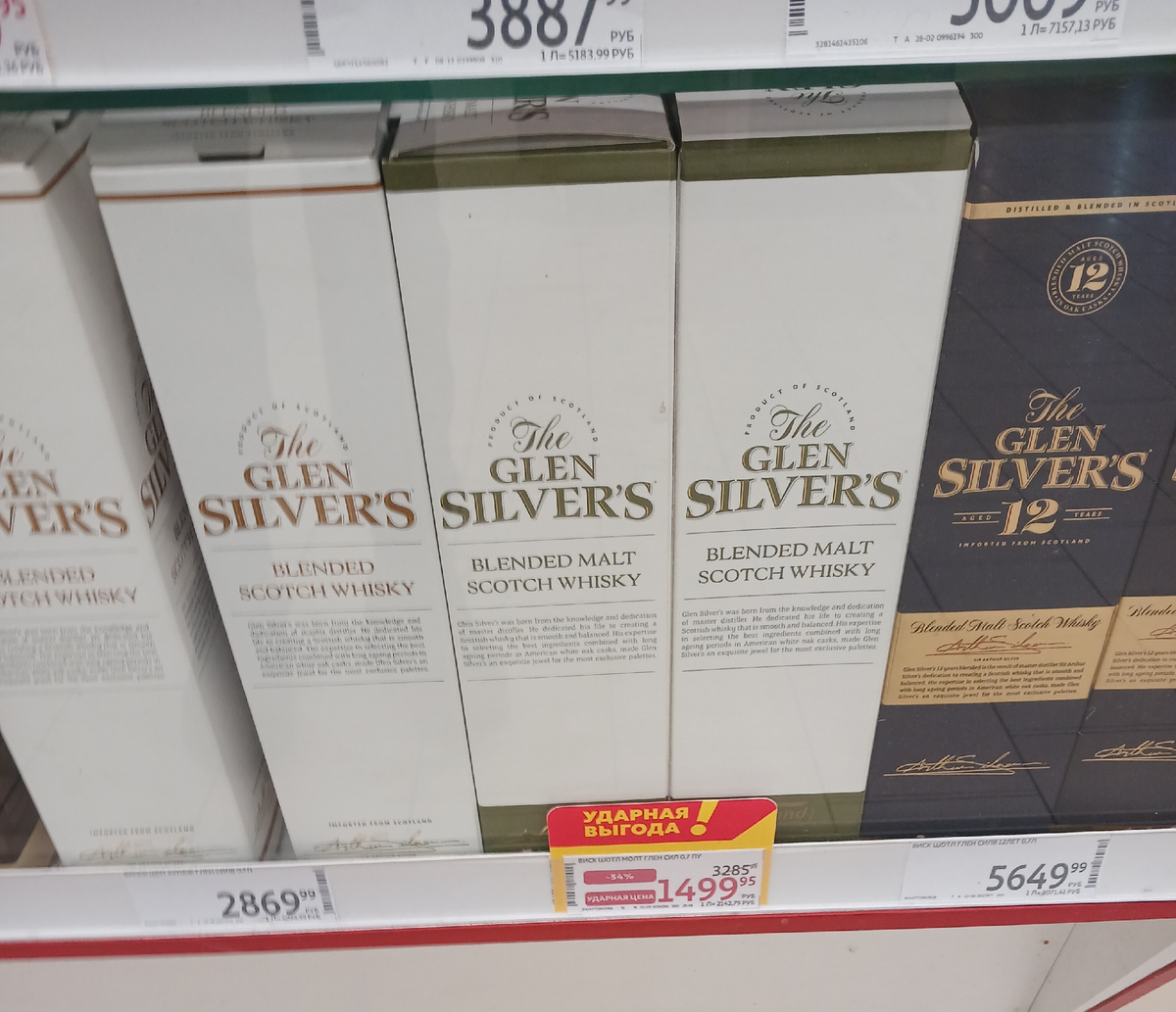Здравствуйте, дорогие друзья. Сегодня о скидках в гипермаркетах Ашан. В супермаркетах данной сети скидки не замечены. Качество фотографий может быть не самым хорошим, многое делалось на расстоянии нескольких метров, у прилавка кассы. Московская область Шотландский солодовый виски разлитый в Испании Glen Silver's Blended Malt. 1499 рублей за бутылку объёмом 0,7 литра. Хорошая цена, сполгода назад, покупал его с большой скидкой в Ленте за 1525. Неплохой виски с лёгкой копчёностью во вкусе. Glengarry - купажированный шотландский виски по 1199 рублей в подарочной коробке с бокалом. Ромы Varadero с Кубы со скидками до 64% по 999 рублей Итальянское белое сухое вино в подарочной коробке с сувениром на выбор - штопор или бокал. 999 рублей. Розлив - май 2024. Скидка 77%, но здесь Ашан изначально поставил крайне высокую цену более 4 тысяч рублей. Gavi розлива 2022 года по 899 рублей Креман из Эльзаса по 999 рублей с учётом скидки 54%. Последняя, в рваной коробке. Справа на верхней полке ещ