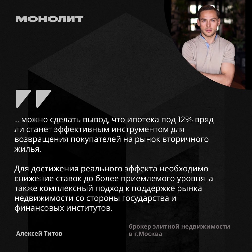 Ипотека в 12% не спасет рынок вторички 🗣Мнение Алексея Титова, брокера элитной недвижимости в г.Москва: Вопрос является актуальным и требует комплексного анализа. Согласие с утверждением о том, что ипотека под 12% сможет вернуть покупателей на рынок вторичного жилья, зависит от множества факторов. Во-первых, необходимо учитывать, что уровень процентной ставки в 12% по-прежнему остается высоким для большинства потенциальных заемщиков. Исторически сложилось так, что ставки выше 10% значительно сокращают доступность жилья для широкой аудитории, особенно для молодых семей и людей с низким и средним доходом. В условиях экономической нестабильности и роста цен на недвижимость, такая ставка может не только не стимулировать спрос, но и привести к его дальнейшему снижению. Во-вторых, следует отметить, что рынок вторичного жилья характеризуется высокой конкуренцией и разнообразием предложений. Потребители становятся более избирательными и предпочитают объекты с лучшими условиями, как по цен