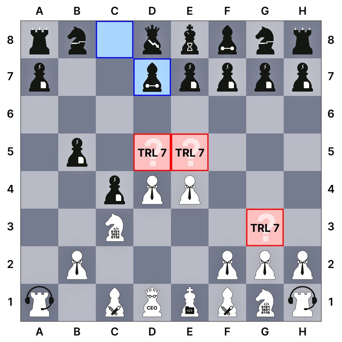 ♟️Патентные шахматы: новый ход Чёрные совершают важный развивающий ход – Bd7, выводя слона с c8 на d7. Этот манёвр преследует несколько целей: 1️⃣ Поддержка пешки b5 – теперь чёрные могут смелее играть на ферзевом фланге, не опасаясь тактических ударов. 2️⃣ Гибкость в развитии – слон на d7 может отступить на c6, усиливая контроль над центром. 3️⃣ Защита короля в случае атаки через несколько ходов Этот ход напоминает ситуацию в бизнесе, когда крупный конкурент, заметив активность стартапа, начинает укреплять свои позиции: инвестирует в R&D, наращивает патентный портфель или корректирует стратегию. Чёрные не просто защищаются – они готовят контригру. ⭐️ Разберем возможные ответы белых – стоит выбор, как реагировать на усиление чёрных? Рассмотрим три варианта: 1️⃣ e5 – агрессивное продвижение Белые идут e4-e5, пытаясь задушить черных пространством. Стартап торопится с выходом на рынок, не завершив все проверки. Лучше воспользоваться моментом, пока черные еще не пришли в себя 2️⃣ g3