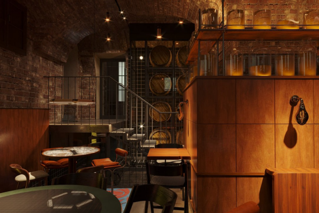 Масштабный проект расположен в историческом особняке 18 века. На первом этаже находятся ресторан, бар и винный магазин. На цокольном — винодельня полного цикла: она пока не работает, но откроется совсем скоро. Однако вина от локальных хозяйств России попробовать предлагают уже сейчас (бокал — от 790 руб.). В баре готовят авторские коктейли на основе вина (900) и классику формата негрони (950), также в карте напитков замечены аперитивы и крепкий алкоголь.