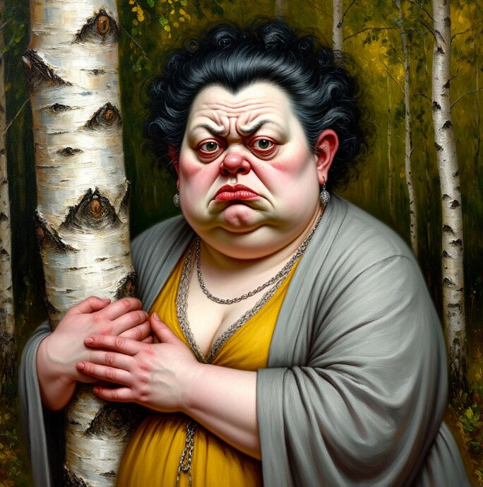 Женщина скрывается в берёзовой роще вслед за роднёй. Обманутая ёлка, посмотрев вокруг себя незамыленным сознанием, радостно машет на прощание своими ветками: ведь женщина жаждет и денег, и признания, и бессмертия на метённых когда-то кем-то парижских улицах.