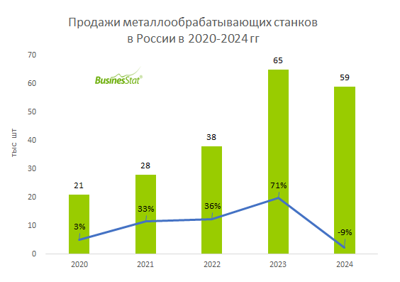 По данным «Анализа рынка металлообрабатывающих станков в России», подготовленного BusinesStat в 2025 г, в 2024 г их продажи в стране сократились на 9% и составили 59 тыс шт.