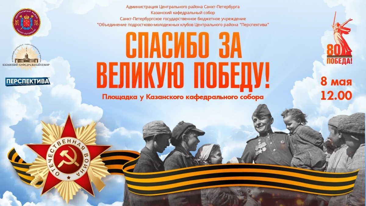 ПРИГЛАШАЕМ НА КОНЦЕРТ "СПАСИБО ЗА ВЕЛИКУЮ ПОБЕДУ!" Казанский кафедральный собор, Администрация Центрального района Санкт-Петербурга и СПб ГБУ "Объединение подростково-молодежных клубов Центрального района "Перспектива" приглашают всех желающих на концерт, посвященный 80-й годовщине Победы в Великой Отечественной войне. В праздничной программе прозвучат песни военных лет, на сцене выступят танцевальные и вокальные коллективы. ✅ Вход свободный. ⠀ ⏰8 мая в 12:00 📍Площадь перед Казанским кафедральным собором (Казанская пл., д. 2)