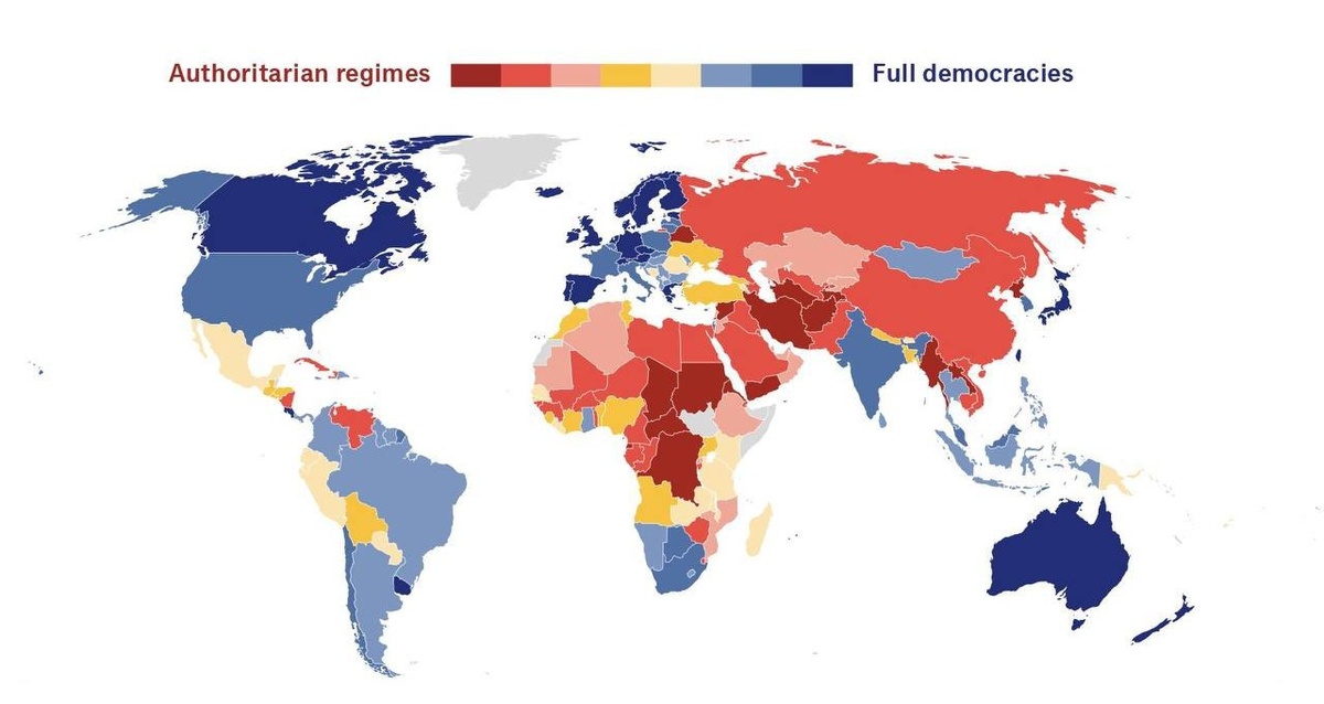The Economist публикует свое мнение о демократических странах. Самый темно-синий - нереально свободные демократы. Самый темно-красный - плохие парни, плевавшие на свободу. Понятно, что объективности там ждать не стоит. Мы всегда "плохие парни" по их мнению. Зато Германию относят к самым демократичным демократам. При том, что самую популярную партию в стране (АдГ неделю назад обошла ХДС/ХСС в опросах и далее точно выйграла бы большинство в парламенте) признали экстремистской на крайне сомнительных основаниях, а региональные отделения этой партии прессовать начали сильно ранее - закрывали счета, отказывали в аренде помещений. Ладно это немцы, они всегда за свободу, даже когда Меркель сидела канцлером 4 срока подряд, ее никто не называл "узурпатором" и не призывал уйти в отставку. - Это у них конституция такая! Весело выглядят Украина и Грузия. Обе где-то середина между полноценной демократией и авторитаризмом. При этом на Украине военное положение со всеми вытекающими: нет вы