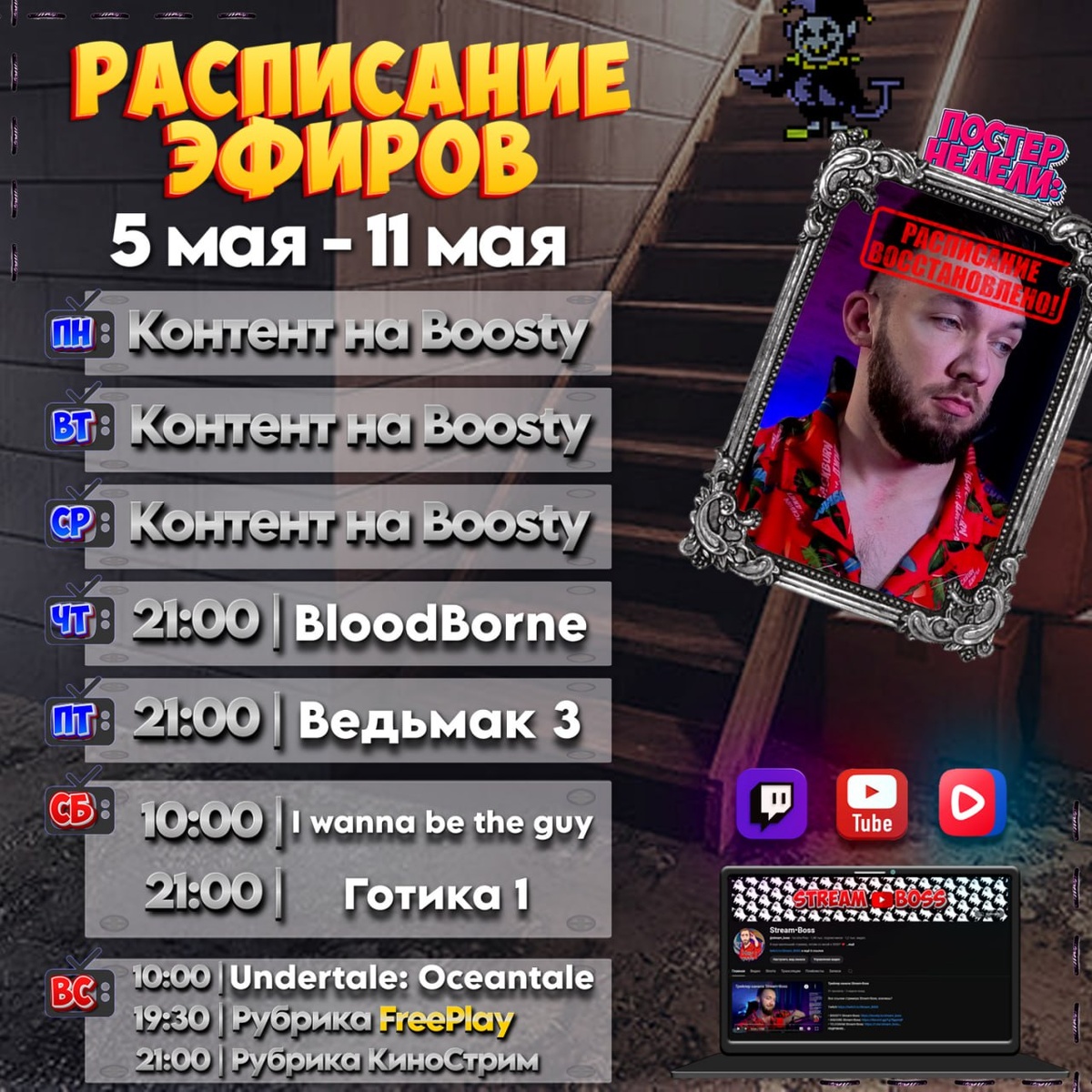 Время отходняка от Марафона! Скучал по расписанию? Вот они, наши слоняры, которых мы будем проходить⬇️ Текущий пул игр, на будущее расписание: 🕺 Mass Effect 3 (заказ) 🕺 Hollow Knight (заказ) 🕺 Silent Hill 2 Remake (заказ) 🕺 I wanna kill the Kamilia (заказ) 🕺 I wanna be the Boshy (заказ) 🐽 The Witcher 3 (заказ) 🕺 Готика 1 🆕 (заказ) 🐽 I wanna be the guy (заказ) 🕺 Dark Souls III 🐽 BloodBorne 🕺 Вселенная Undertale Много слов не будет, пожелаю всем хорошей недели и обнимаю, крепко-крепко 💛 ➡️А еще, интересный факт, у меня есть ДЗЕН 📱, Nuum, Дискорд 📱 и VK 📱 видео, я про них редко говорю, мне будет очень приятно, если поддержишь и там.. 😳 ➡️Эксклюзивный контент здесь Бусти 📱 ➡️Нарезки стримов Нарезки 📱 ЖМЯК сюда, чтобы перейти в расписание и знать где его искать, всю неделю и не потерять! #расписание #стримов #стримбосс