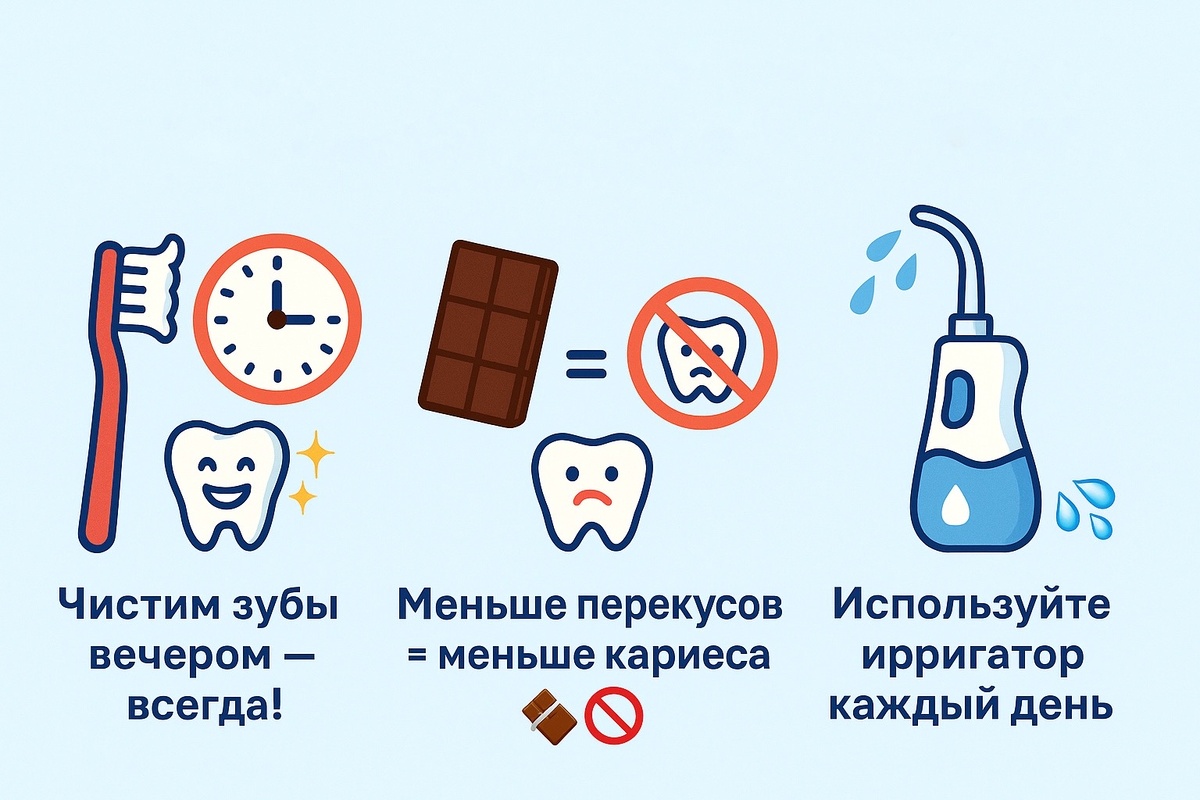 Кариес — одна из самых распространённых и коварных проблем с зубами. Он не болит до последнего, а потом внезапно превращается в дорогое лечение и испорченное настроение. Но есть хорошие новости: кариес можно предотвратить. Делимся тремя простыми, но эффективными советами, как это сделать. 1. Не игнорируйте вечернюю чистку Многие уверены: «Я же с утра почистил зубы, вечером можно и пропустить». Но именно ночью во рту создаётся идеальная атмосфера для размножения бактерий. Что делать: 2. Снизьте количество «перекусов на бегу» Каждый раз, когда вы едите — особенно что-то сладкое — уровень кислотности в полости рта повышается. Это разрушает эмаль и даёт зелёный свет кариесу. Совет: 3. Используйте ирригатор каждый день Зубная щётка — это хорошо, но между зубами она не справляется. Там, в труднодоступных участках, и начинается кариес. Ирригатор решает эту проблему. Почему это работает: Итог Беречь зубы — это не сложно. Немного дисциплины, немного техники — и ст