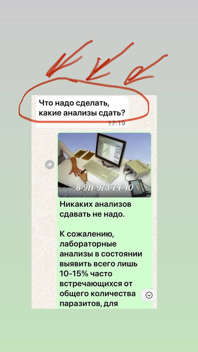 Никаких анализов сдавать не надо. К сожалению, лабораторные анализы в состоянии выявить всего лишь 10-15% часто встречающихся от общего количества паразитов, для остальных 85% в лаборатории просто не существует реагентов для их выявления. Достоверность выявления паразитов по анализам составляет всего лишь 55-65%, в то время, как достоверность ВРТ 85-95%, а в базе ВРТ содержатся частоты более 65 000 паразитов. Я провожу Частотно-Резонансное Тестирование (ВРТ), которое выявляет всех паразитов с достоверностью 85-95%.