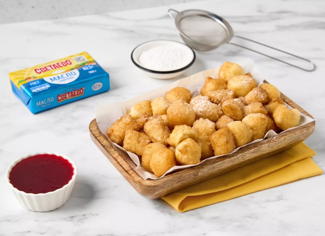 Заваривают не пончики, а тесто для них. Сначала в сотейнике нагревают масло и воду, потом добавляют муку и замешивают основу. Затем тесто доводят до нужной консистенции с помощью яиц. Здесь очень важно активно перемешивать массу, чтобы яйца не свернулись. После обжаривания в растительном масле маленькие шарики увеличатся в размерах. Можно посыпать пончики сахарной пудрой, полить шоколадной глазурью или начинить кремом из кондитерского шприца. Сливочное масло 90 г Пшеничная мука хлебопекарная 1 стакан = 130 г Вода 300 мл = 300 г Куриное яйцо 4 шт. = 240 г Соль. 1 щепотка = 1 г Подсолнечное масло рафинированные 1 л = 1000 г Сахарная пудра 1 ст. л. = 25 г Просейте муку. Подготовьте кастрюлю и глубокий сотейник. Нарежьте сливочное масло кубиками, положите их в кастрюлю. Влейте воду к маслу. Поставьте кастрюлю на средний огонь. Часто помешивая массу, дождитесь, когда она закипит, а масло полностью растает. Добавьте соль и снимите кастрюлю с огня. Всыпьте муку к смеси из горячей воды и мас