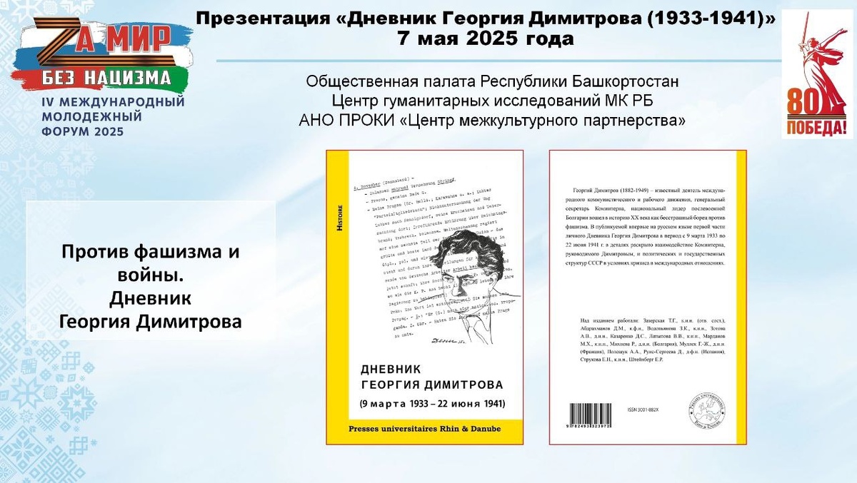 📖 7 мая состоится презентация книги «Дневник Георгия Димитрова за 1933-1941 гг.» В Конгресс-холле «Торатау» 7 мая 2025 года в 9:30 ч. состоится презентация книги «Дневник Георгия Димитрова за 1933-1941 гг.» в рамках проведения IV Международного молодежного форума «За мир без нацизма», посвященного 80-летию Победы в Великой Отечественной войне. Публикацию презентуют докторант Российского государственного гуманитарного университета Зазерская Татьяна Георгиевна (г. Москва) и профессор факультета международных отношений Санкт-Петербургского государственного университета Зотова Анастасия Валерьевна. Данная книга является продолжением выпущенной к 75-летию Победы в 2020 г. части Дневника за 1941-1945 гг., и охватывает период 1933–1941 гг., события которого начинаются с ареста Димитрова в Германии по надуманному обвинению в поджоге Рейхстага 9 марта 1933 г. и заканчиваются 22 июня 1941 г. В Дневнике отражено поведение Димитрова на Лейпцигском процессе, показана роль Коминтерна в организ