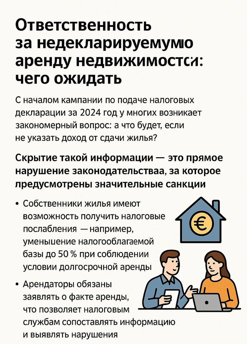 Ответственность за недекларируемую аренду недвижимости: чего ожидать Скрытие информации о доходе от сдачи недвижимости в аренду — это прямое нарушение законодательства, за которое предусмотрены значительные санкции. Обязанность декларирования арендного дохода Закон требует, чтобы сведения об аренде указывались в декларации как собственниками, так и арендаторами: Собственники жилья имеют возможность получить налоговые послабления — например, уменьшение налогооблагаемой базы до 50% при соблюдении условий долгосрочной аренды. Арендаторы обязаны заявлять о факте аренды, что позволяет налоговым службам сопоставлять информацию и выявлять нарушения. Санкции за неуплату налогов с аренды В случае, если налоговые органы установят факт сокрытия дохода от аренды, нарушителю грозит штраф — от половины до полуторакратной величины неуказанной суммы. Размер санкций зависит от тяжести нарушения: Мелкое нарушение (до 3 000 евро без признаков умысла): штраф в размере 50% Серьезное (превышение 3